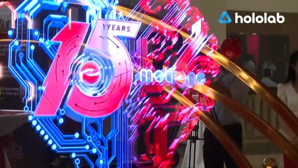 Trong dịp kỷ niệm 15 năm hoạt động tại Campuchia, Metfone đã mang đến một trải nghiệm công nghệ ấn tượng cho khách mời tham dự bằng việc sử dụng công nghệ hologram tại không gian trưng bày thành tựu của mình. Công nghệ này, được triển khai bởi Hololab cùng với đối tác HCC Production, đã tạo ra một không gian 3D sống động, với hình ảnh hologram làm điểm nhấn nổi bật, thu hút sự chú ý của quan khách ngay từ cái nhìn đầu tiên. Sự kết hợp giữa ánh sáng, hình ảnh, và công nghệ đã phản ánh một cách sinh động những thành tựu mà Metfone đã đạt được trong suốt 15 năm hoạt động tại Campuchia.