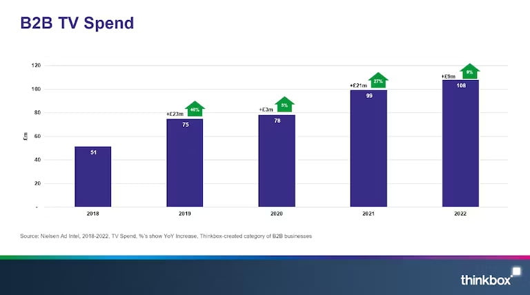 Theo dữ liệu của Nielsen, các doanh nghiệp B2B tại Anh đã tăng gấp đôi đầu tư vào quảng cáo trên truyền hình trong vòng 4 năm qua, tổng cộng 108 triệu bảng trong năm 2022.