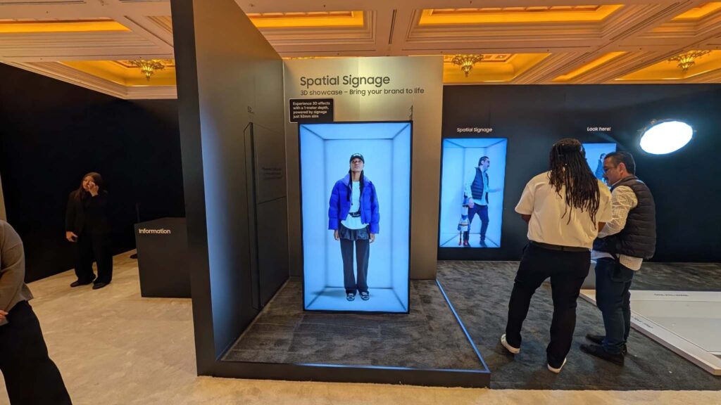 Samsung Spatial Signage có thể nói là biển hiệu 3D siêu mỏng không cần kính đầu tiên trên thế giới. Màn hình 85 inch tạo hiệu ứng chiều sâu cho nội dung 2D mà không yêu cầu người xem đeo kính hỗ trợ. Đây có thể nói là một tính năng vượt trội của loại màn hình không gian này, nó giúp hiển thị hiệu ứng một cách tự nhiên, tạo sự chú ý trong các không gian bán lẻ, các bảo tàng cũng như địa điểm giải trí. Từ đó, các chương trình khuyến mãi, thông tin quan trọng của các doanh nghiệp trở nên nổi bật, dễ dàng tiếp cận gần hơn với công chúng.