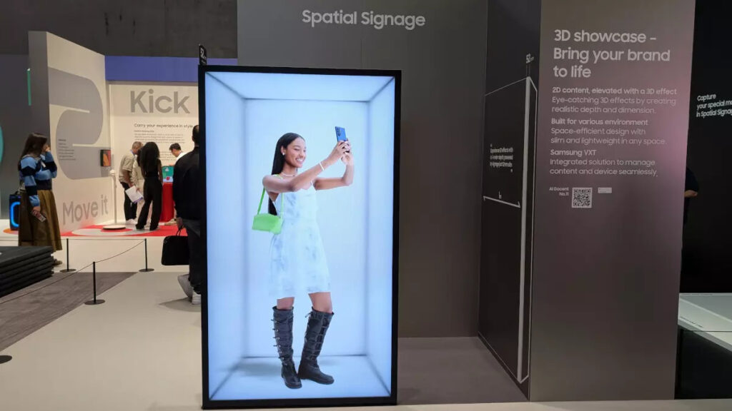 Spatial Signage, một loại màn hình kỹ thuật số 3D của Samsung mới vừa ra mắt gần đây, đã ngay lập tức thu hút sự chú ý của khán giả toàn cầu. Bằng cách kết hợp giữa màn hình LED, cảm biến cùng môi trường thực tế, giải pháp màn hình 3D này đã trở thành một bước tiến đột phá, đưa màn hình kỹ thuật số ra khỏi những khung hình chữ nhật phẳng truyền thống để trở thành một phần của kiến trúc và trải nghiệm không gian. Sự ra đời của Spatial Signage cho thấy rằng Samsung không chỉ quan tâm đến khả năng hiển thị mà còn xem như một giải pháp thu hút sự chú ý trong thị trường mua sắm đầy cạnh tranh như hiện nay.